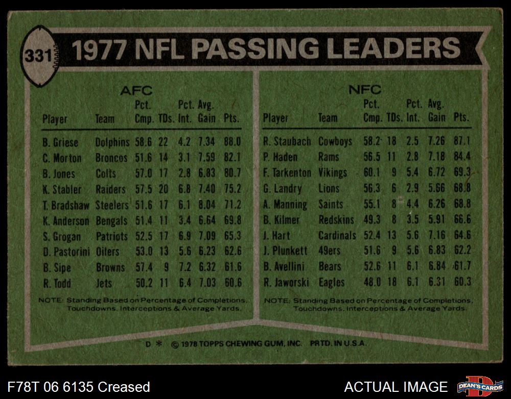 1978 Topps #331 - Bob Griese / Roger Staubach Passing Leaders 1 - POOR