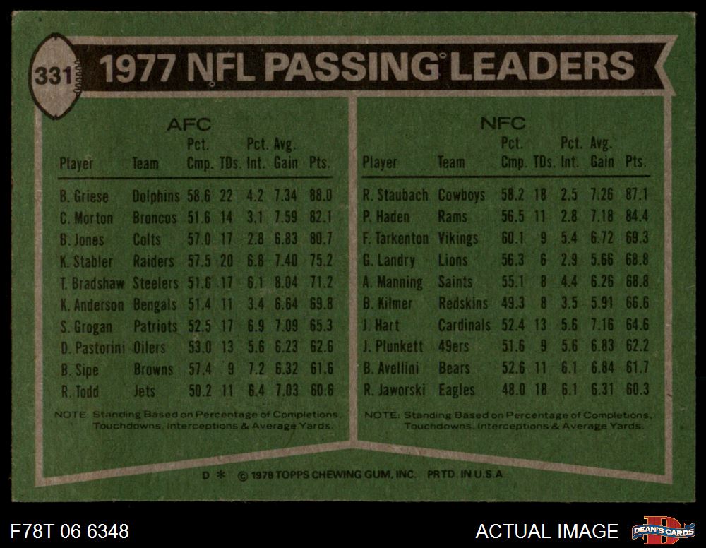 1978 Topps #331 - Bob Griese / Roger Staubach Passing Leaders 5.5 - EX+