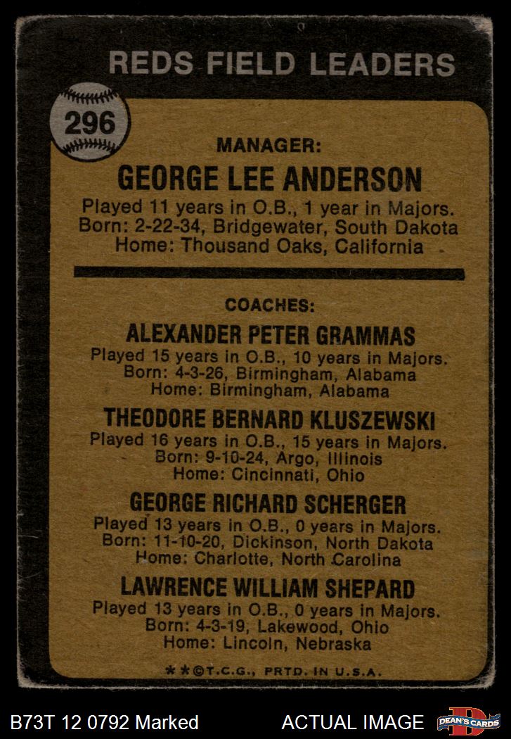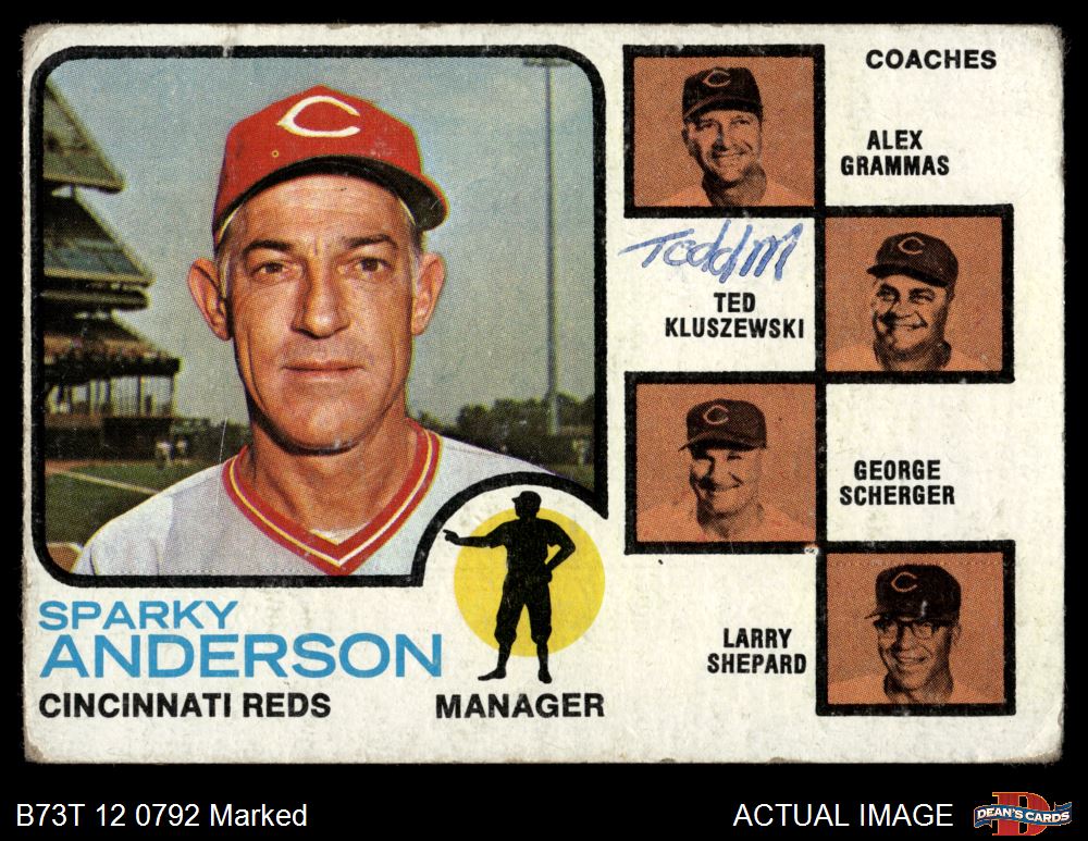 1973 Topps #296 - Sparky Anderson / Alex Grammas / Ted Kluszewski / George Scherger / Larry Shepard Reds Leaders 1 - POOR