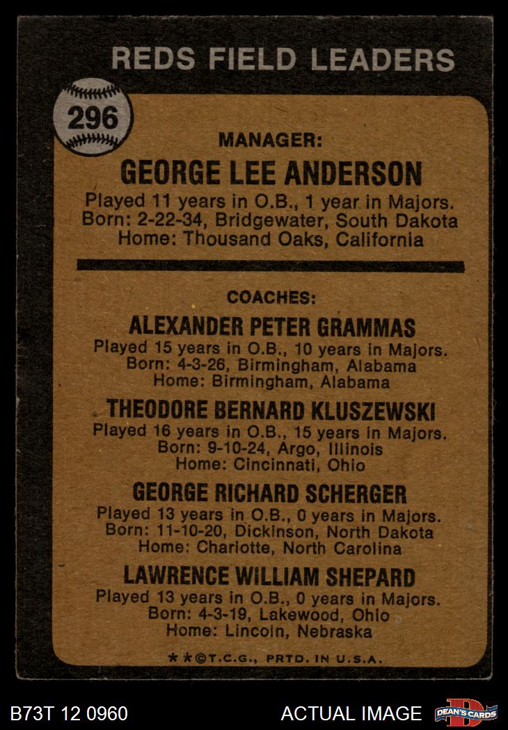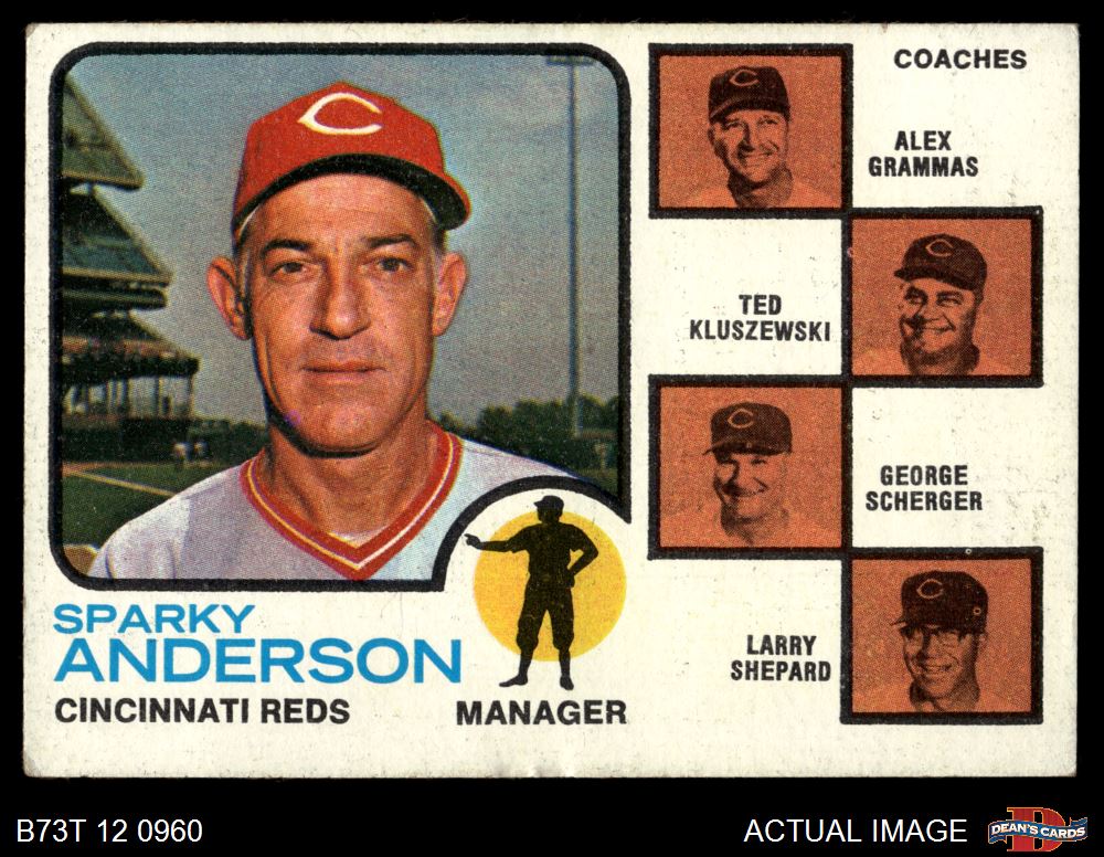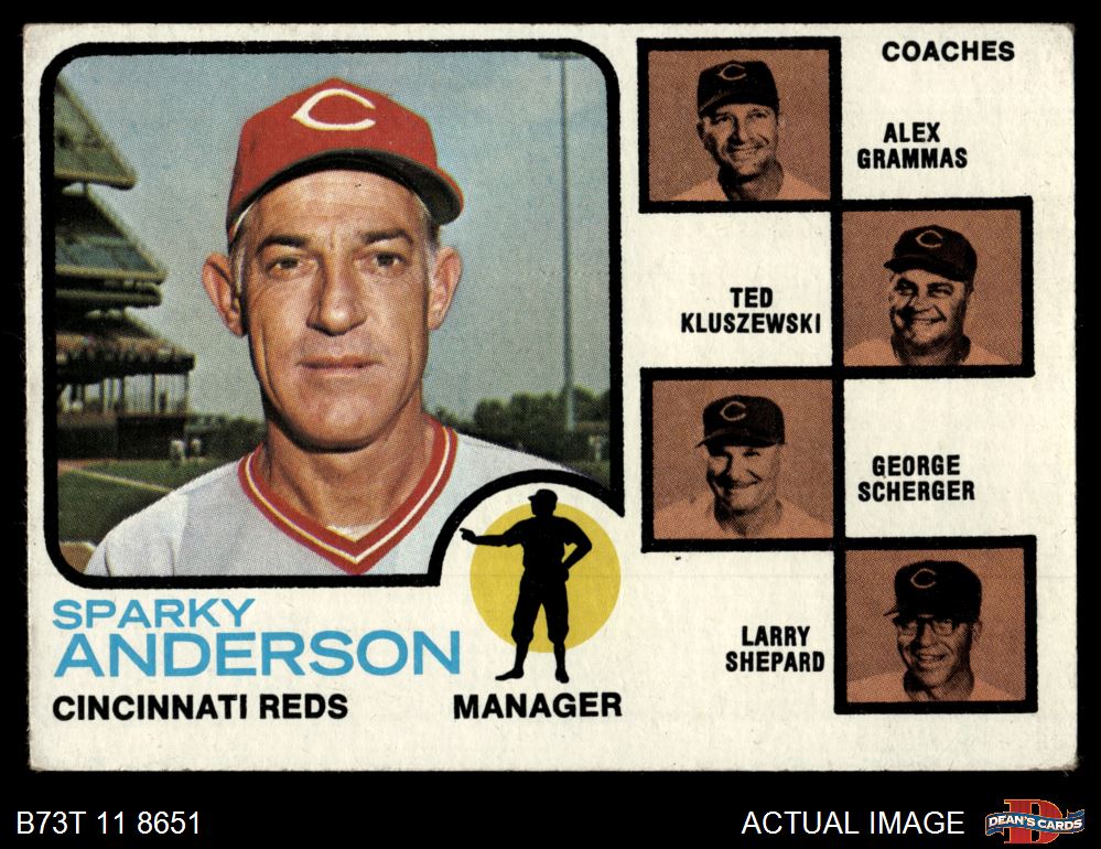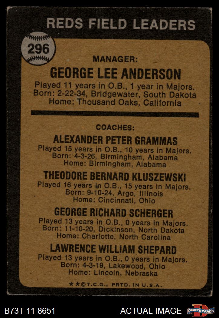 1973 Topps #296 - Sparky Anderson / Alex Grammas / Ted Kluszewski / George Scherger / Larry Shepard Reds Leaders 3 - VG