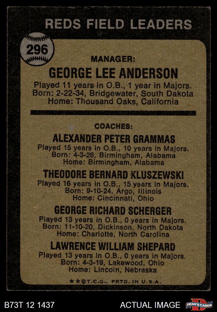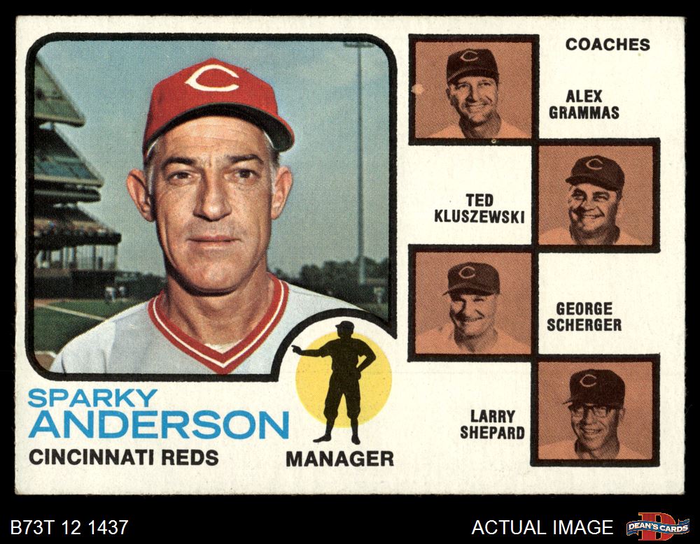 1973 Topps #296 - Sparky Anderson / Alex Grammas / Ted Kluszewski / George Scherger / Larry Shepard Reds Leaders 6 - EX/MT