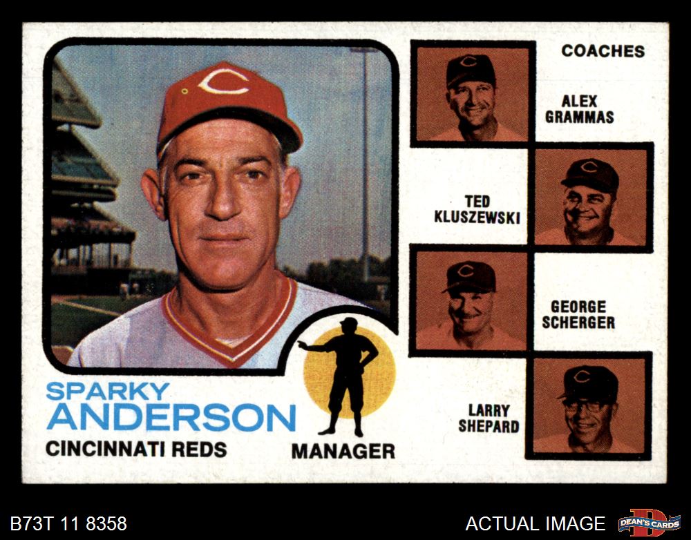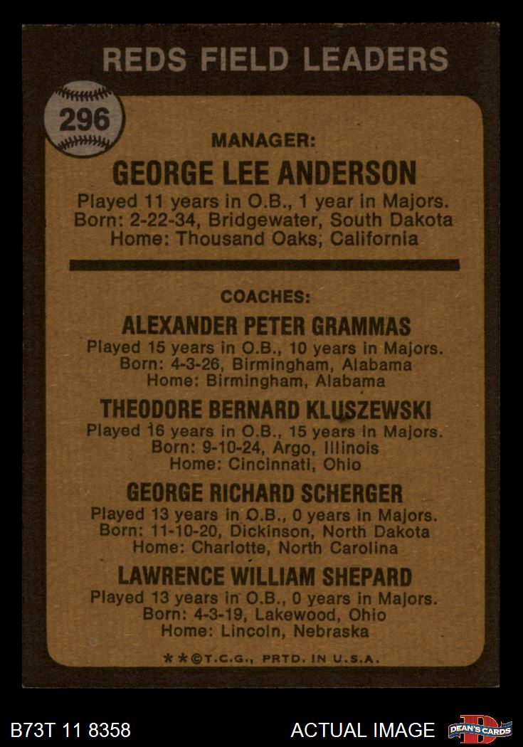 1973 Topps #296 - Sparky Anderson / Alex Grammas / Ted Kluszewski / George Scherger / Larry Shepard Reds Leaders 7 - NM
