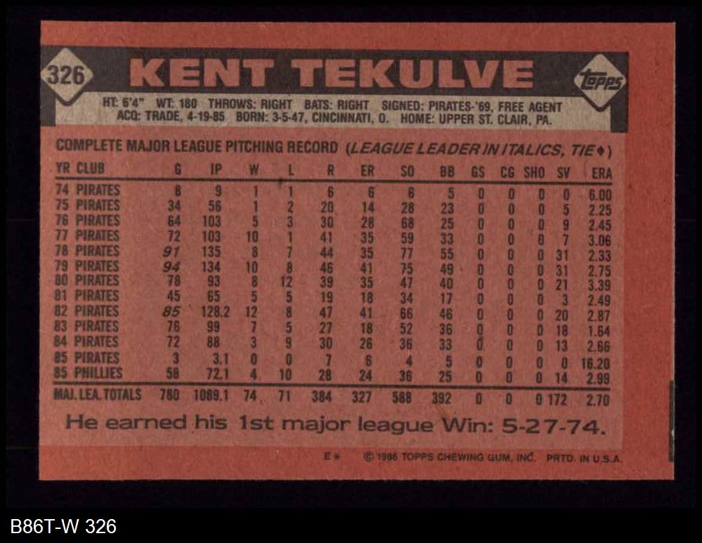 1986 Topps #326 Kent Tekulve 8 - NM/MT