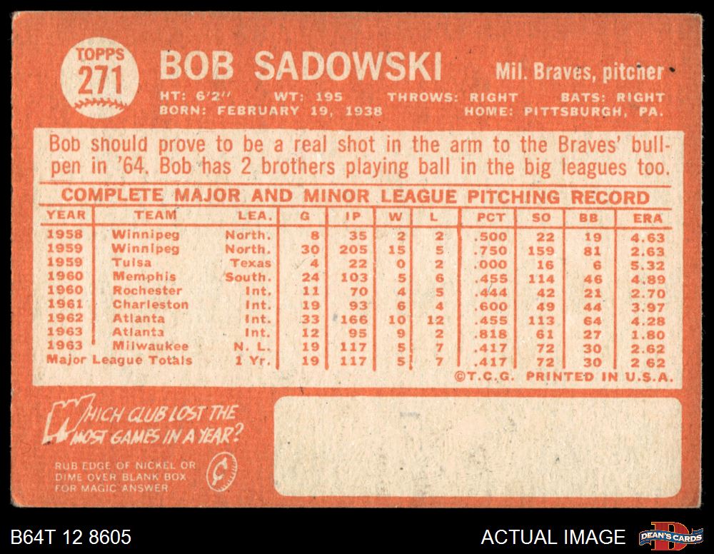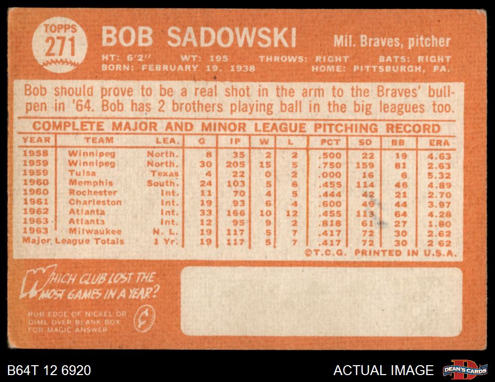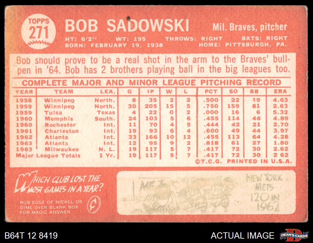 1964 Topps #271 Bob Sadowski 2 - GOOD