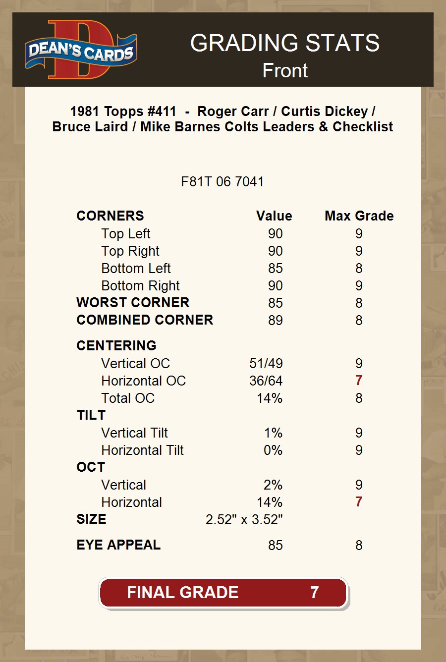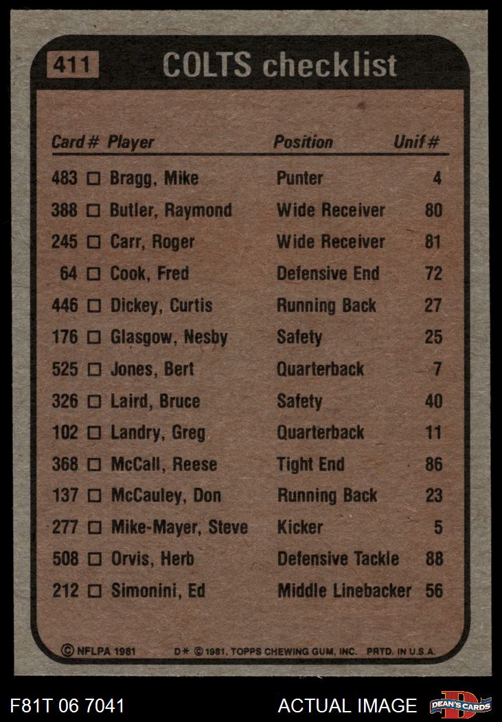 1981 Topps #411 - Roger Carr / Curtis Dickey / Bruce Laird / Mike Barnes Colts Leaders & Checklist 7 - NM