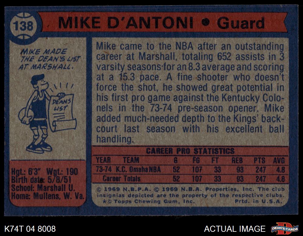 1974 Topps #138 Mike D'Antoni 3 - VG