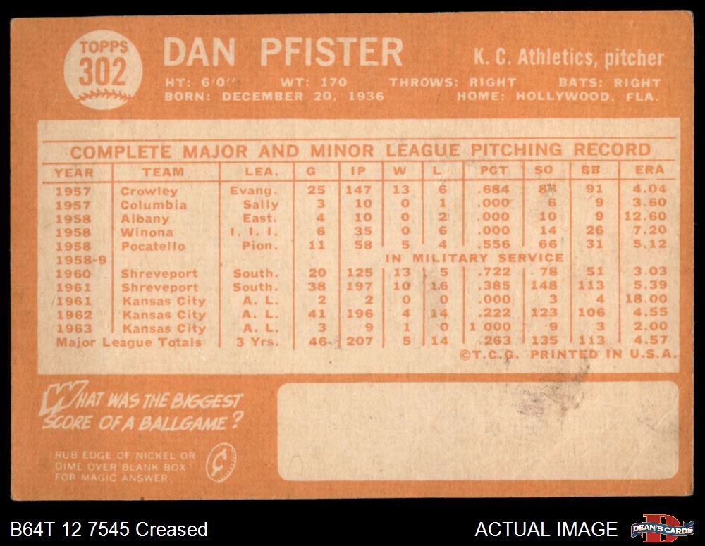 1964 Topps #302 Dan Pfister 1.5 - FAIR