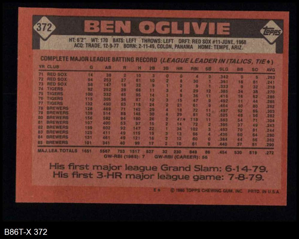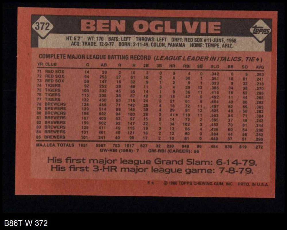 1986 Topps #372 Ben Oglivie