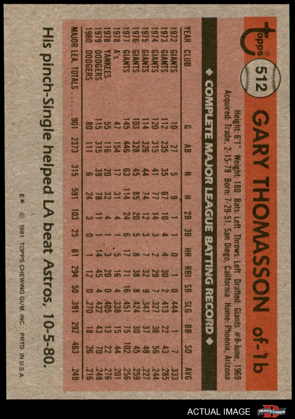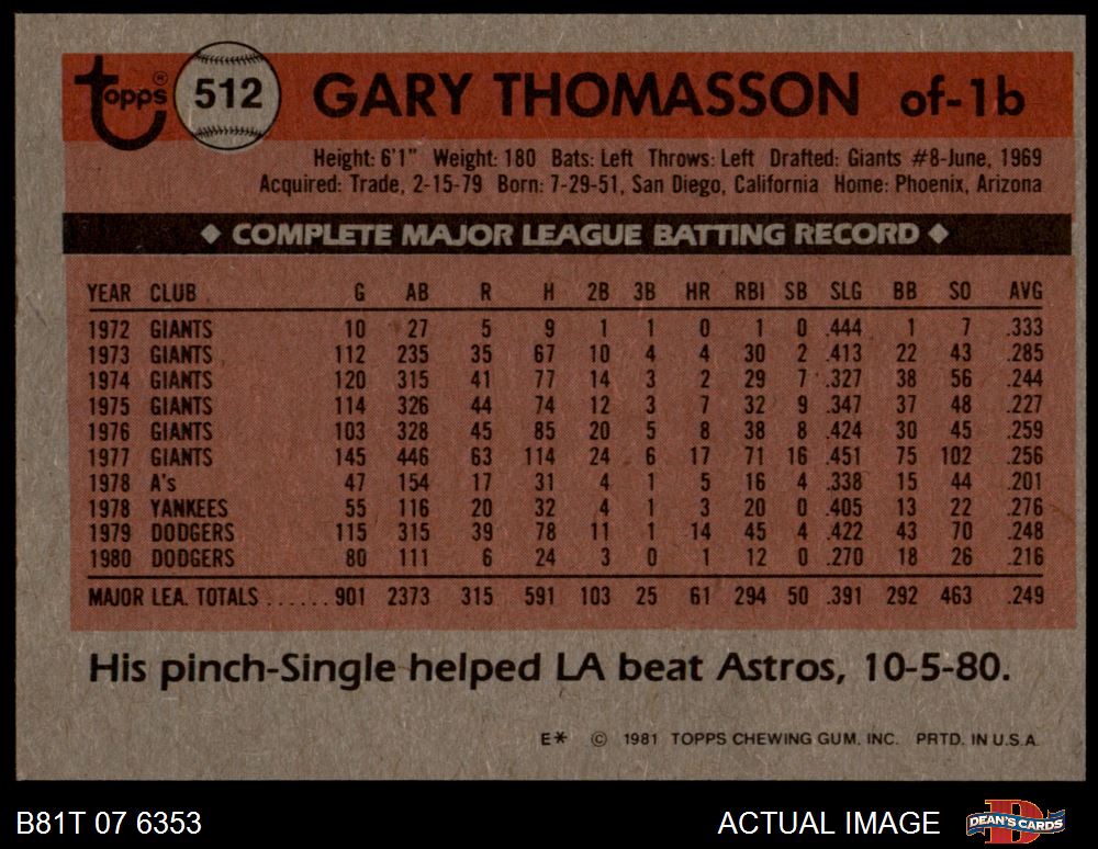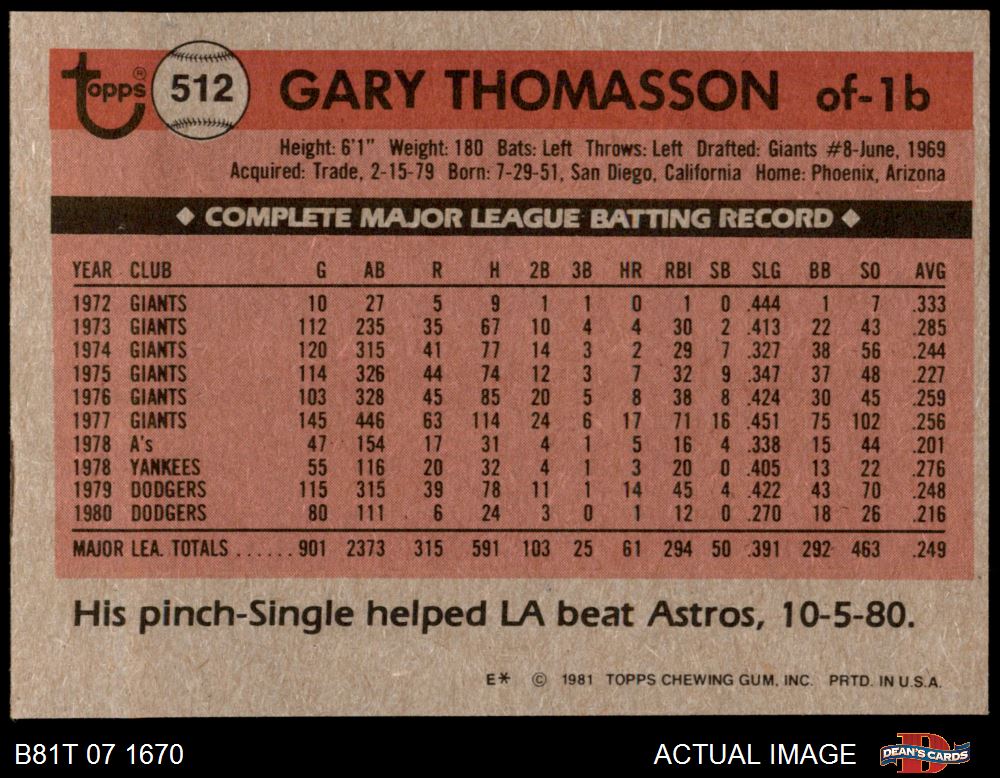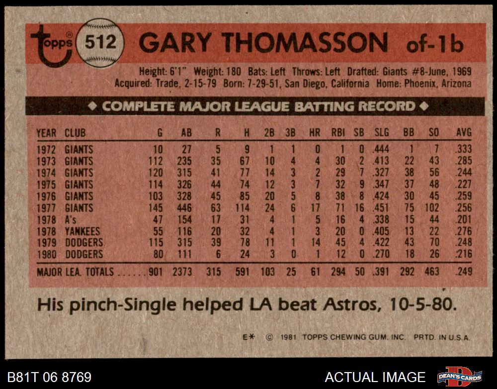 1981 Topps #512 Gary Thomasson 8 - NM/MT