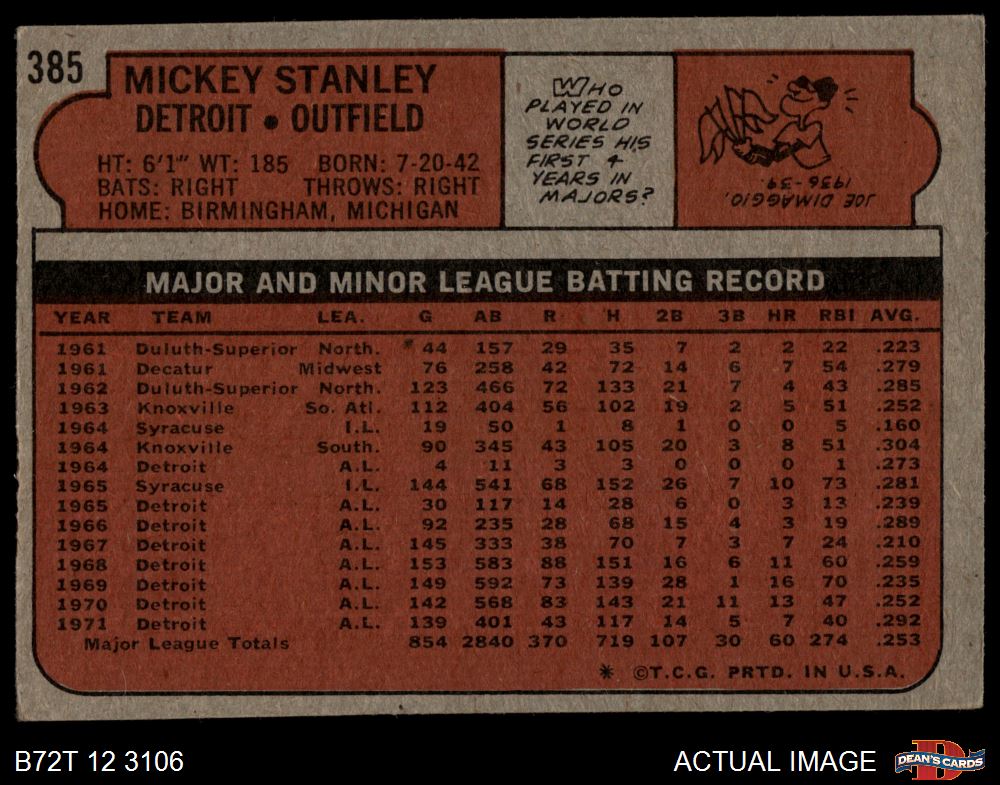 1972 Topps #385 Mickey Stanley 3 - VG