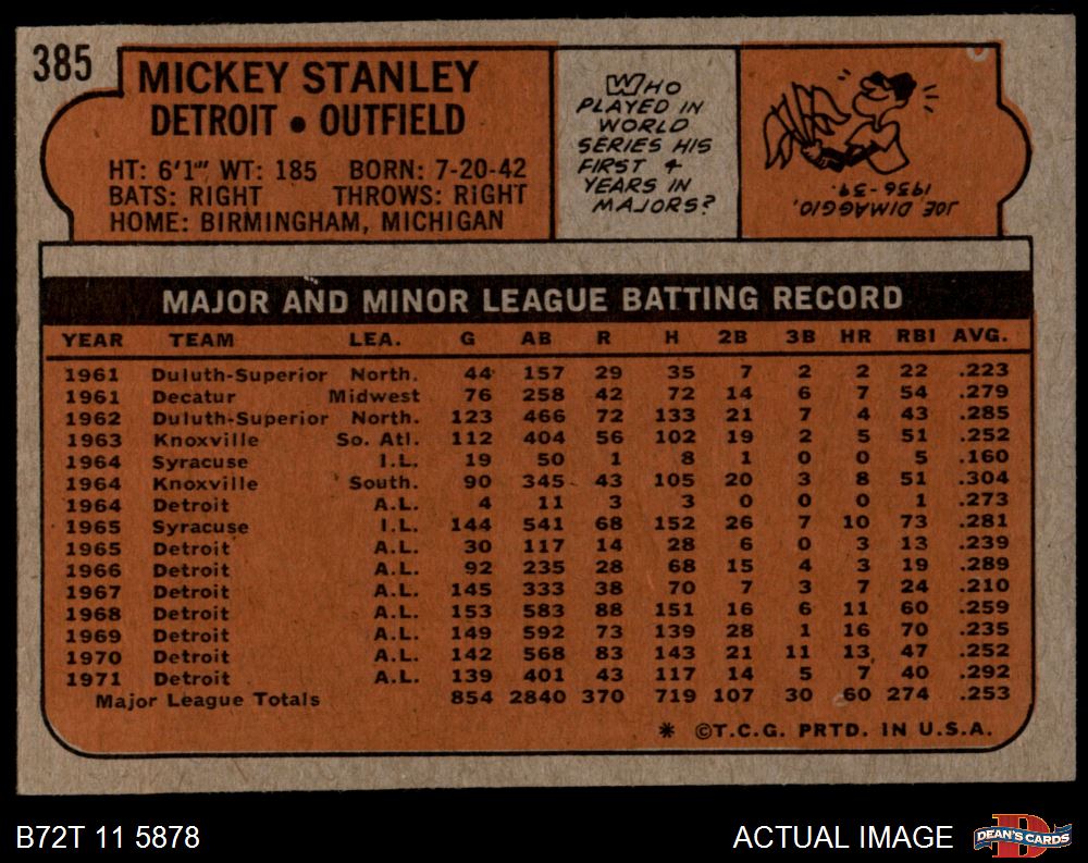 1972 Topps #385 Mickey Stanley 6.5 - EX/MT+