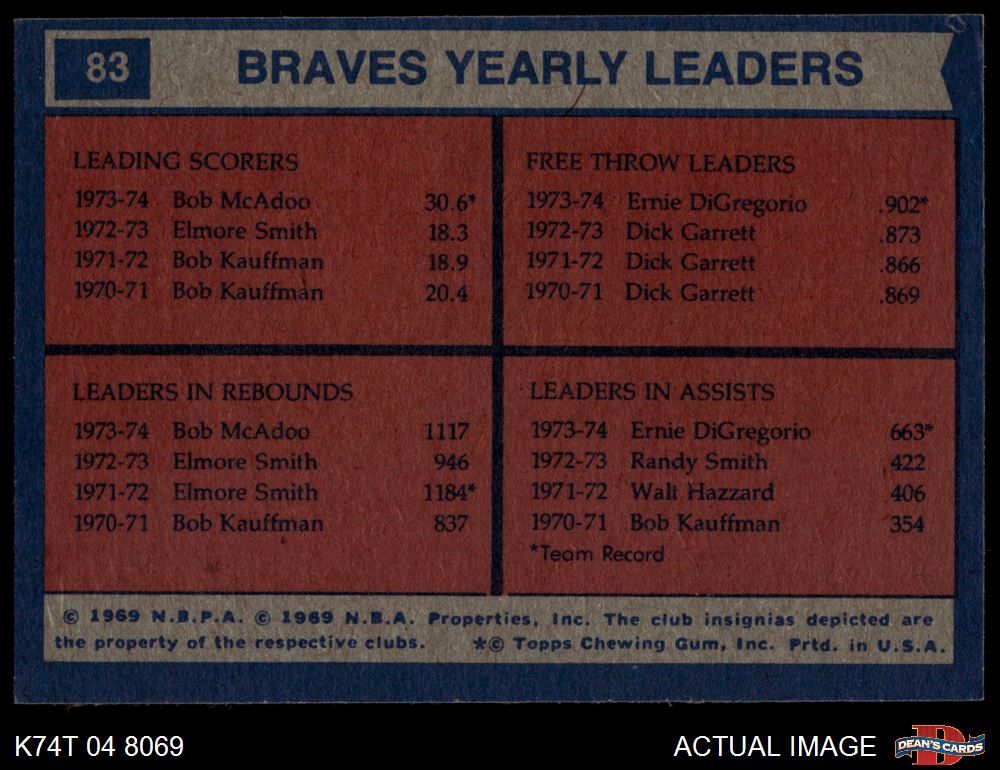 1974 Topps #83 - Ernie DiGregorio / Bob McAdoo Braves Leaders 4 - VG/EX