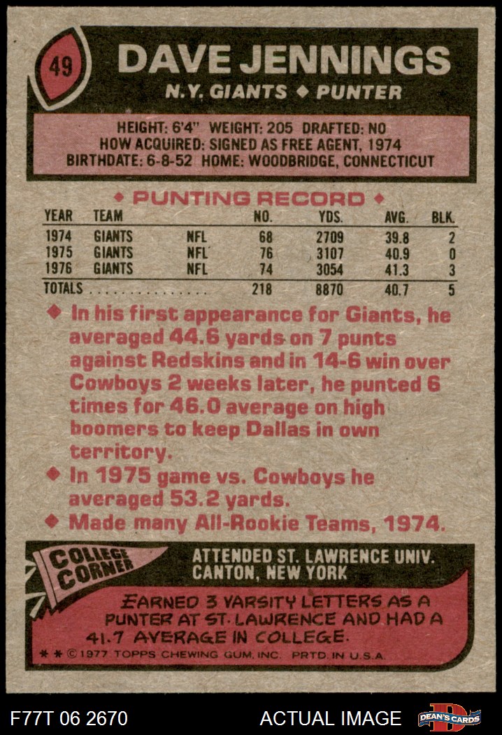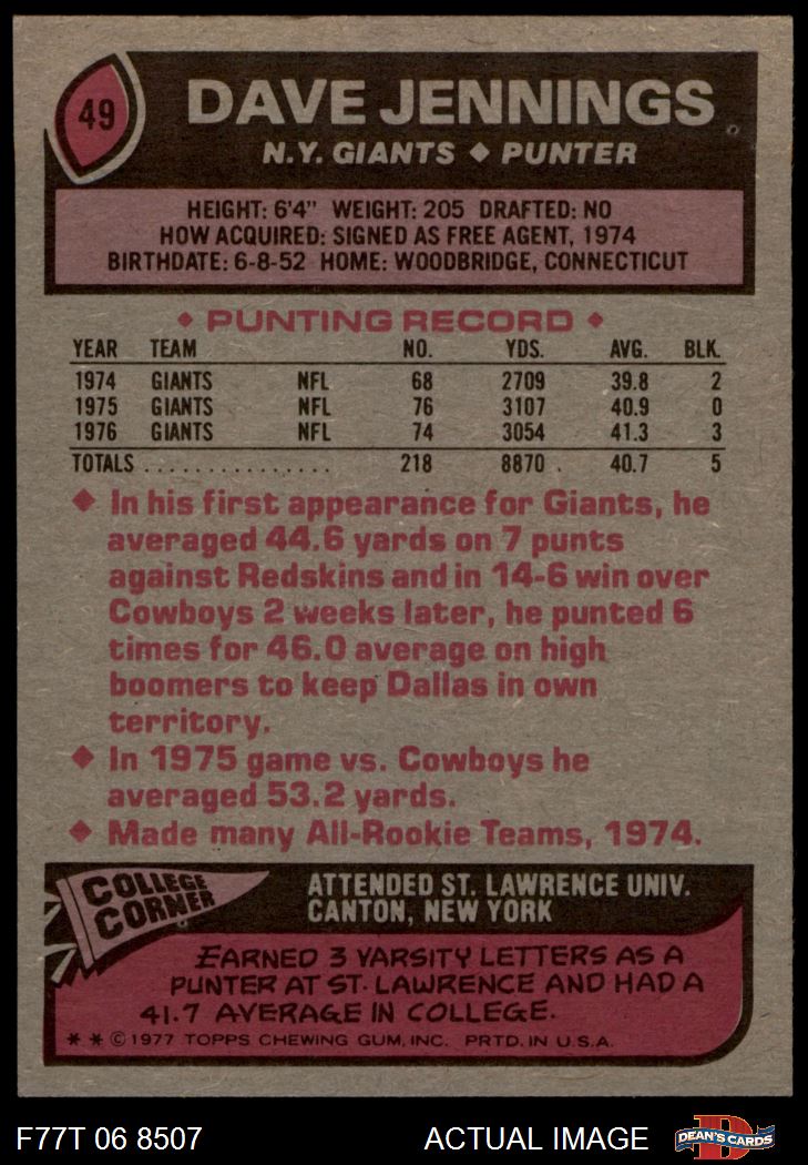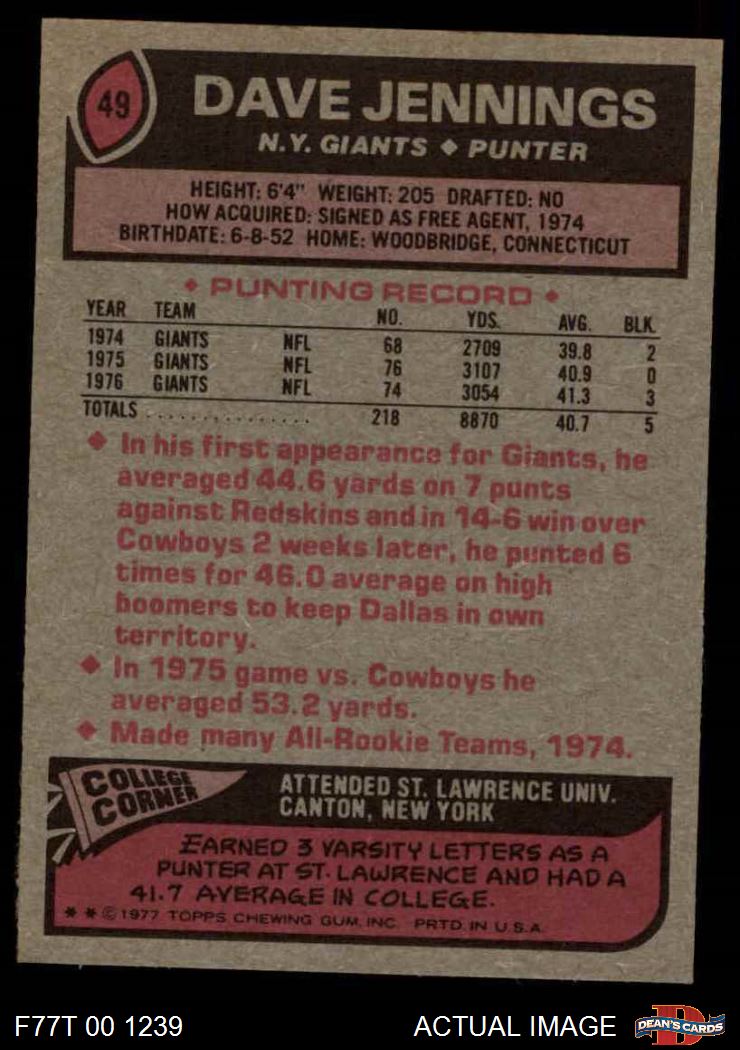 1977 Topps #49 Dave Jennings 8 - NM/MT