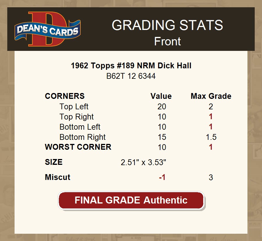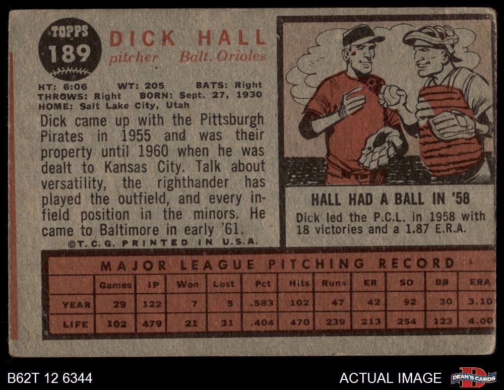 1962 Topps #189 NRM Dick Hall AUTHENTIC