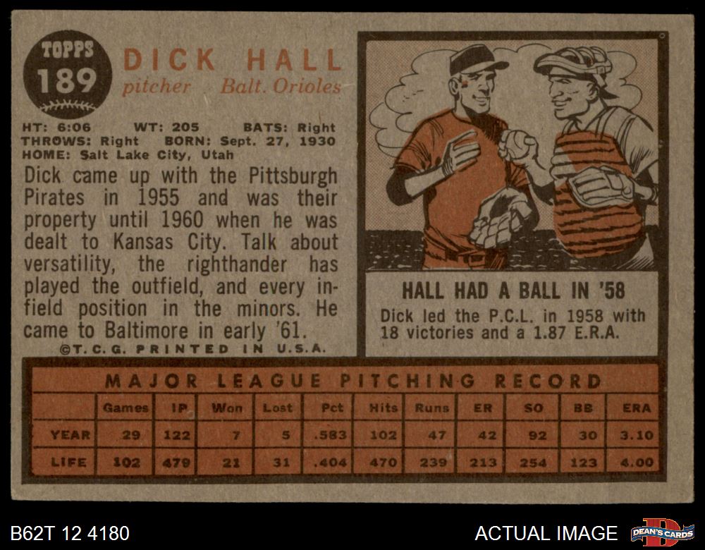 1962 Topps #189 NRM Dick Hall 2 - GOOD