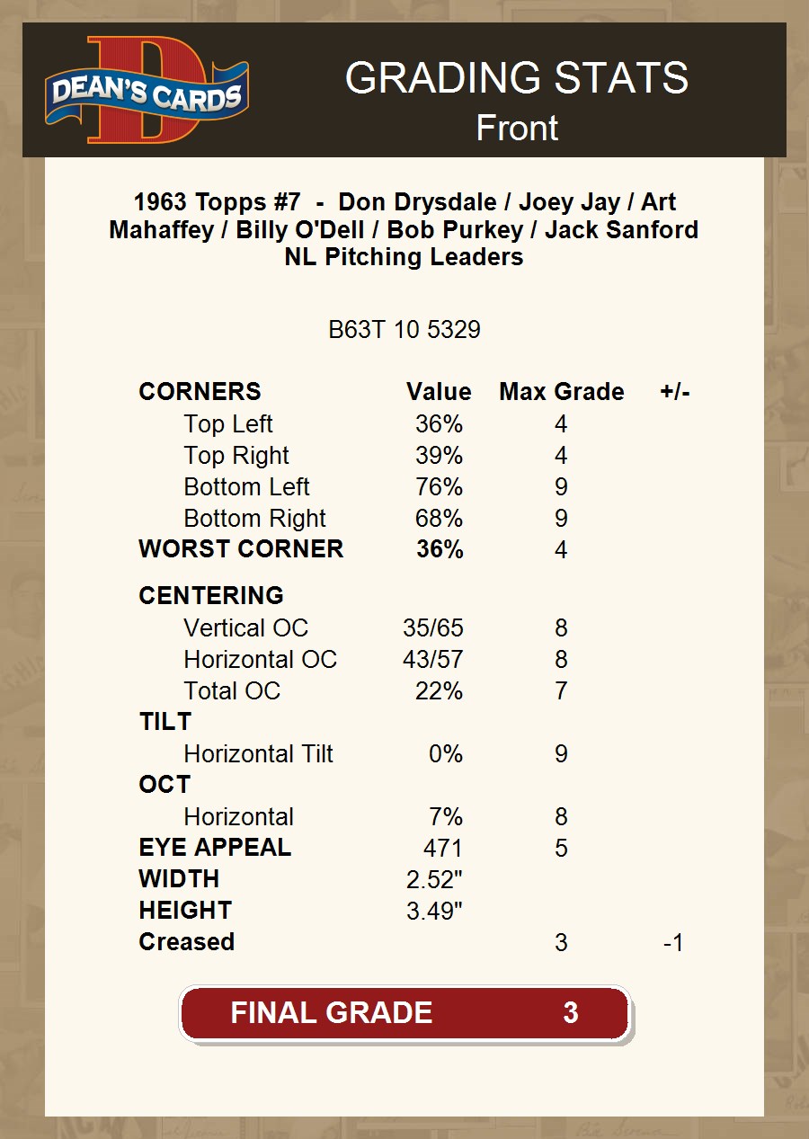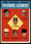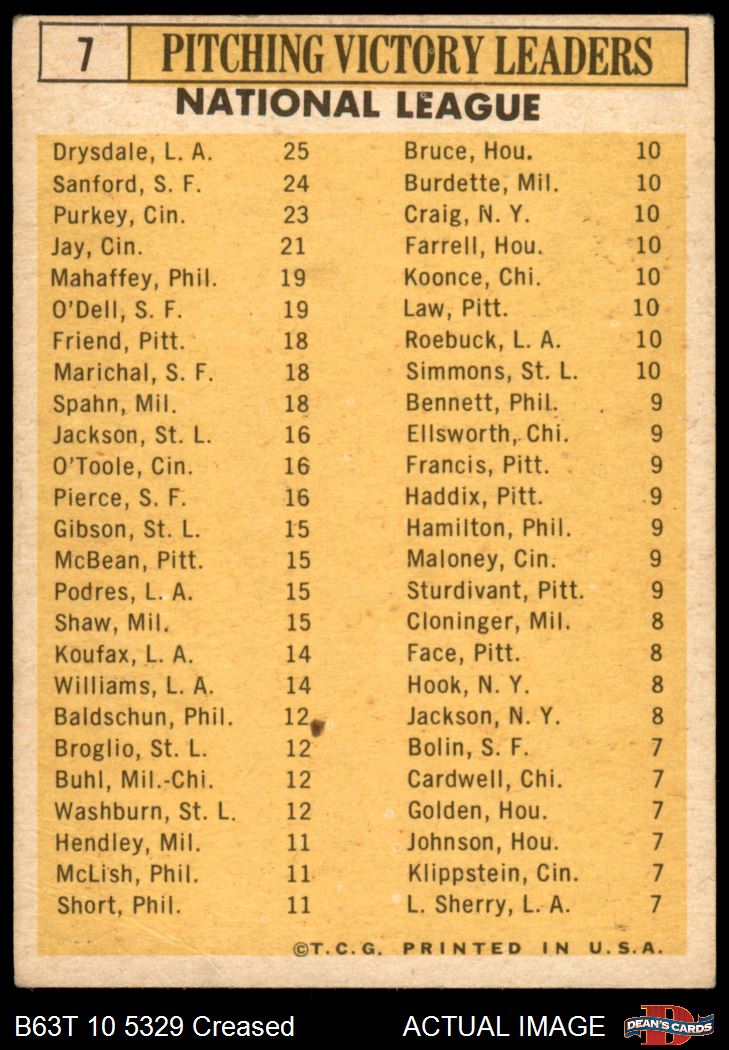 1963 Topps #7 - Don Drysdale / Joey Jay / Art Mahaffey / Billy O'Dell / Bob Purkey / Jack Sanford NL Pitching Leaders 3 - VG