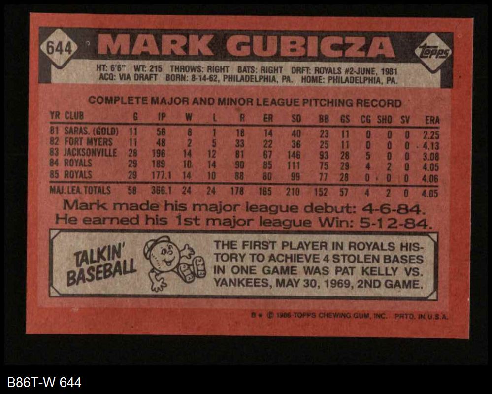 1986 Topps #644 Mark Gubicza 8 - NM/MT