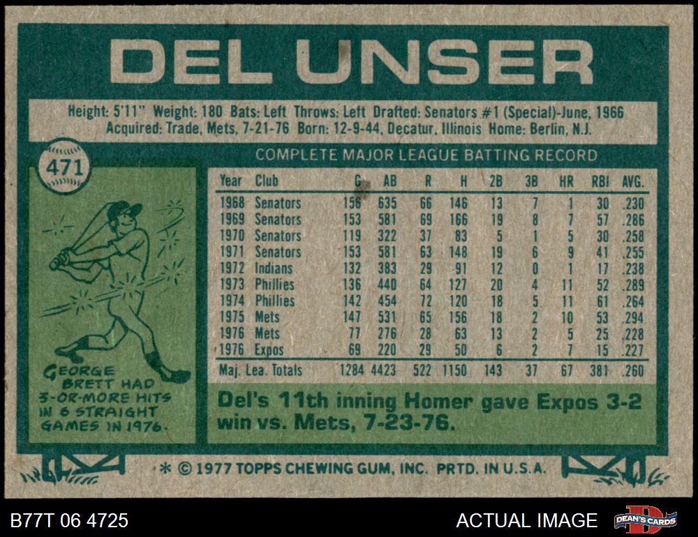 1977 Topps #471 Del Unser 6.5 - EX/MT+