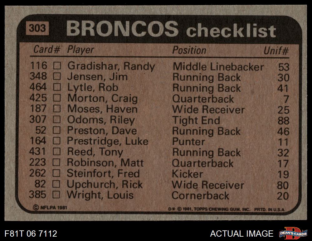 1981 Topps #303 - Jim Jensen / Haven Moses / Steve Foley / Rulon Jones Broncos Leaders & Checklist 7 - NM