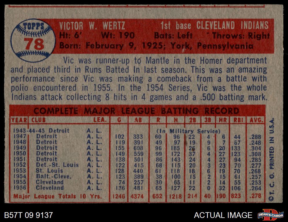 1957 Topps #78 Vic Wertz 3 - VG