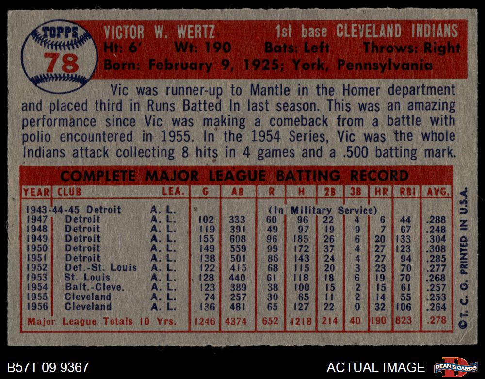 1957 Topps #78 Vic Wertz 4.5 - VG/EX+