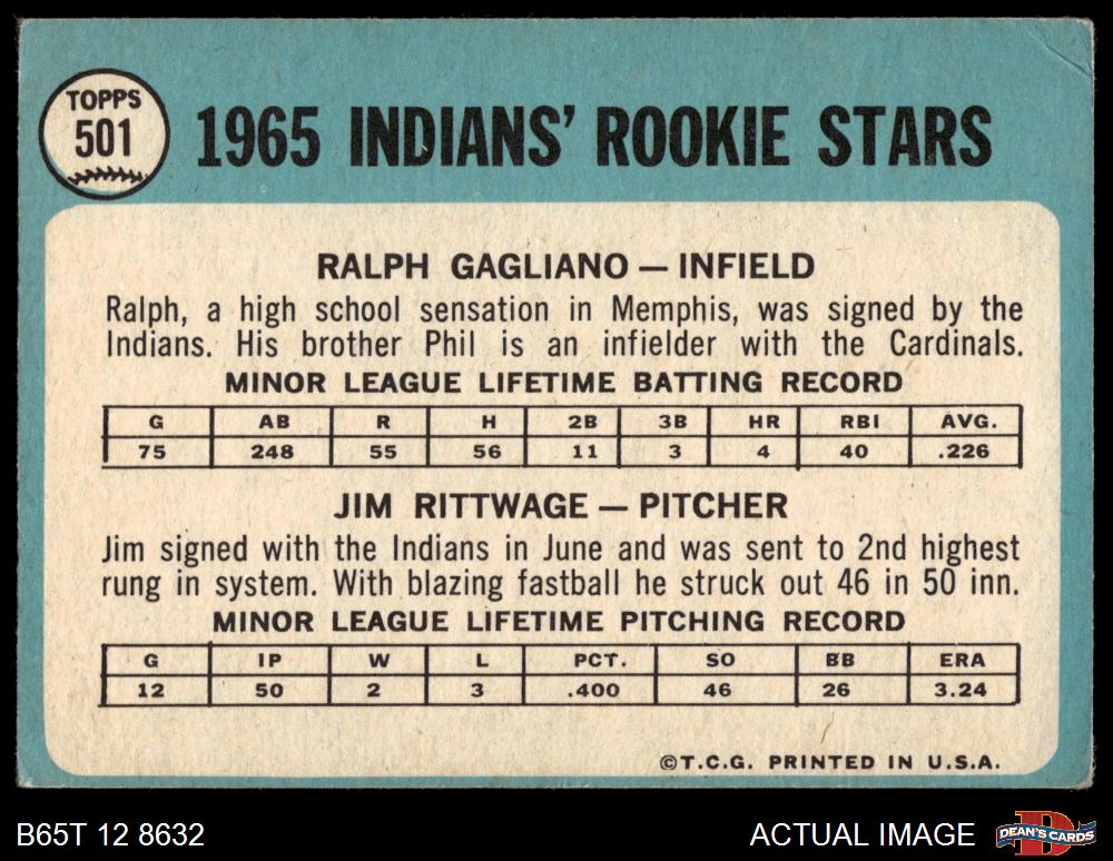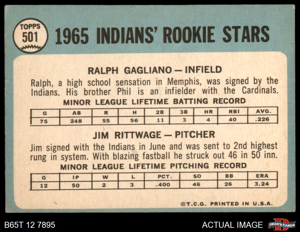 1965 Topps #501 - Jim Rittwage / Ralph Gagliano Indians Rookies 2 - GOOD
