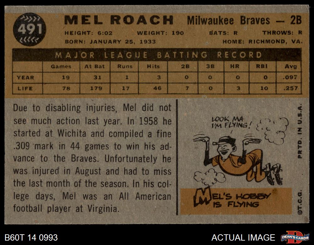 1960 Topps #491 Mel Roach 6.5 - EX/MT+