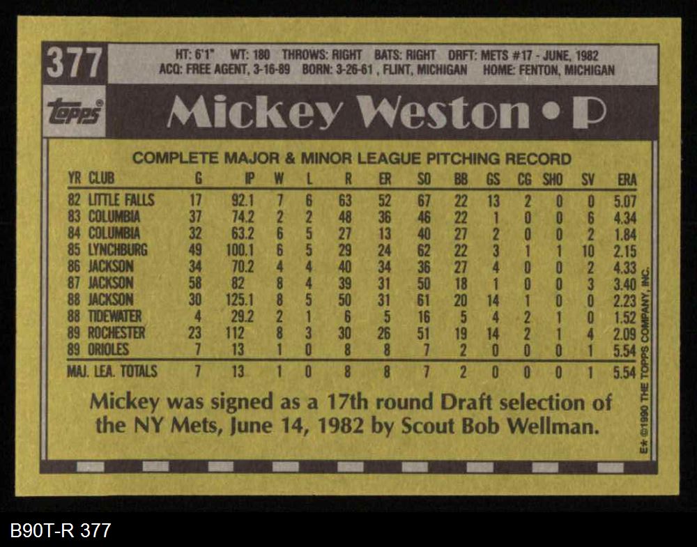 1990 Topps #377 Mickey Weston 8 - NM/MT