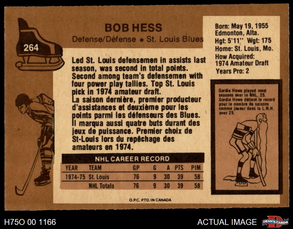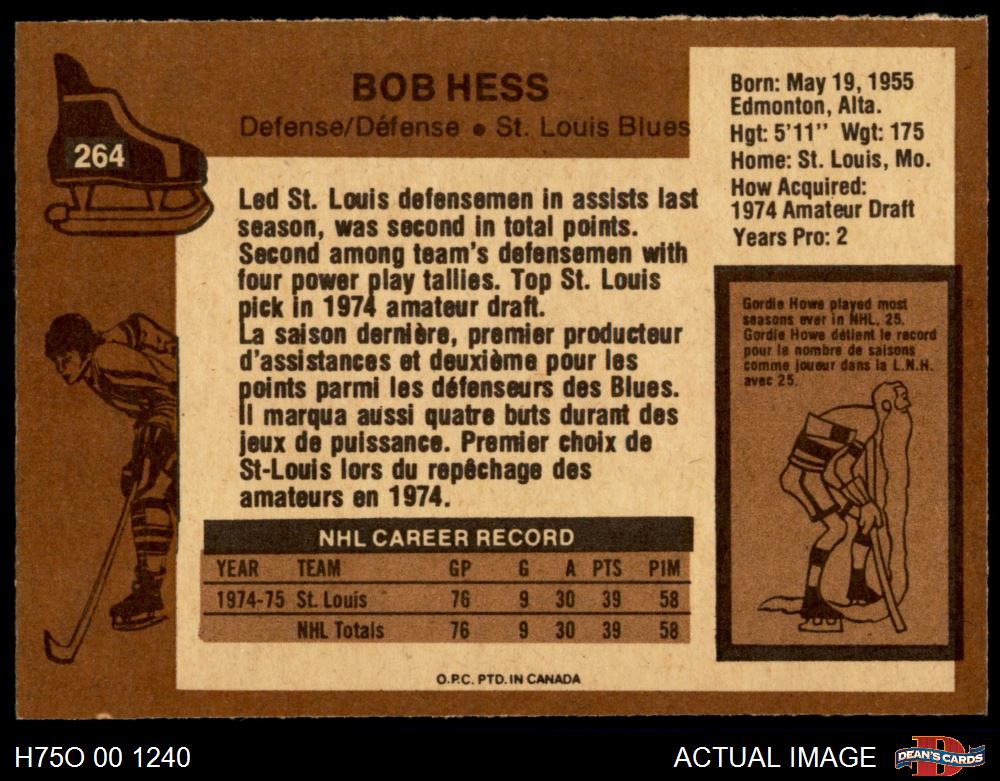 1975 O-Pee-Chee NHL #264 Bob Hess 7 - NM