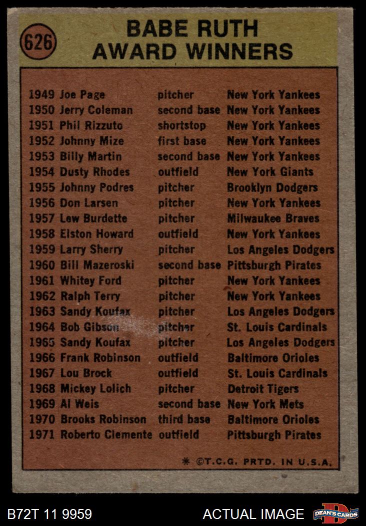 1972 Topps #626 Babe Ruth Award 4 - VG/EX