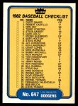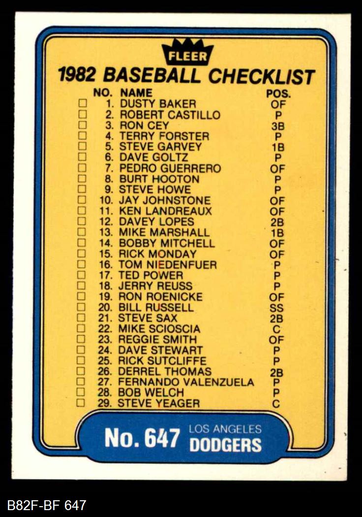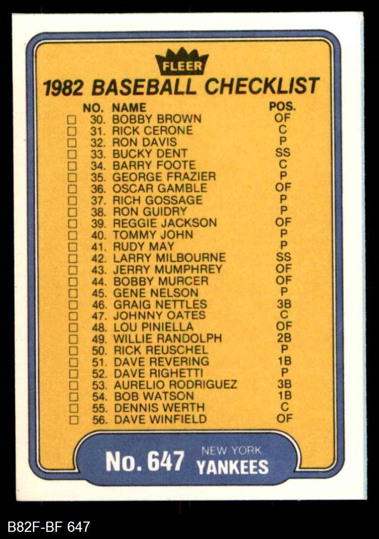 1982 Fleer #647 Yankees / Dodgers Checklist