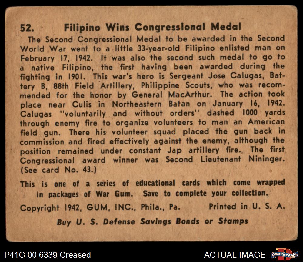 1941 War Gum #52 Filipino Wins Congressional Medal 2 - GOOD