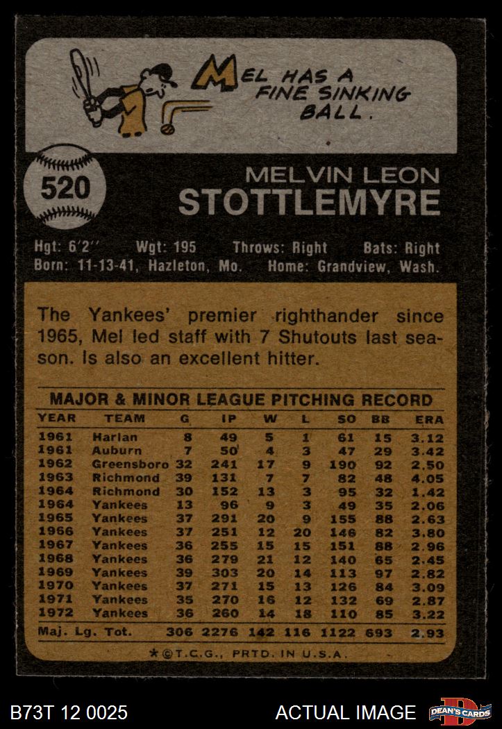 1973 Topps #520 Mel Stottlemyre 6.5 - EX/MT+