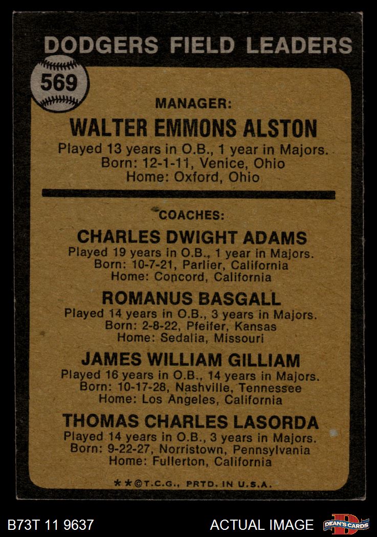 1973 Topps #569 - Walt Alston / Red Adams / Monty Basgall / Jim Gilliam / Tommy Lasorda Dodgers Leaders 7 - NM