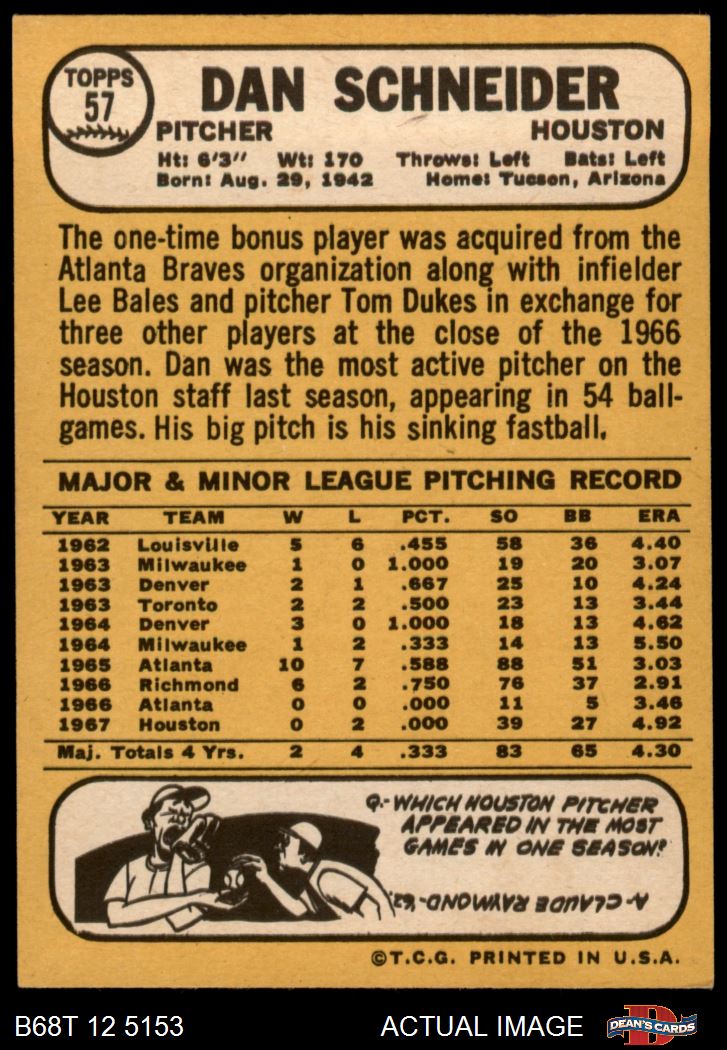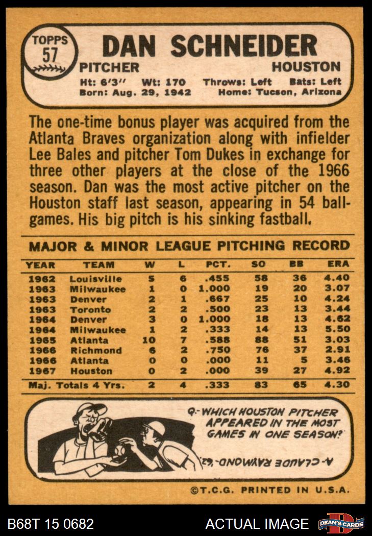 1968 Topps #57 A Dan Schneider 8 - NM/MT