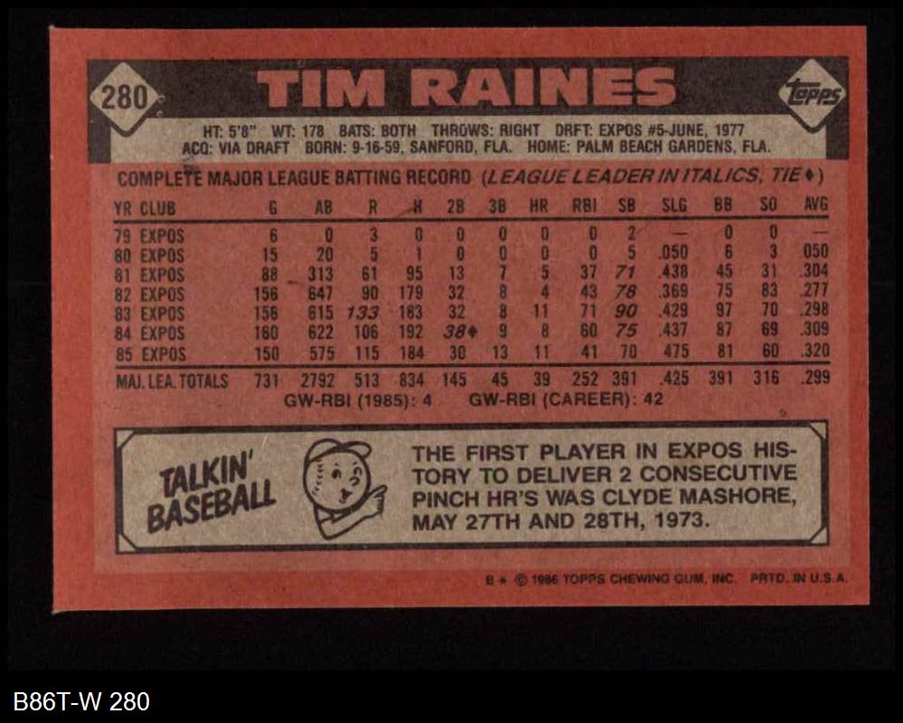 1986 Topps #280 Tim Raines