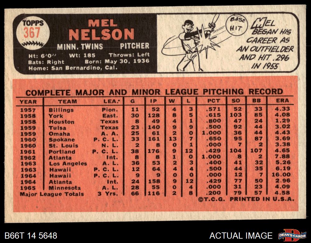 1966 Topps #367 Mel Nelson 5 - EX