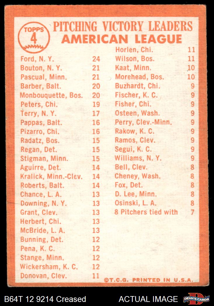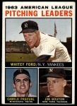 1964 Topps #4 xAP  -  Whitey Ford / Camilo Pascual / Jim Bouton AL Pitching Leaders Front Thumbnail