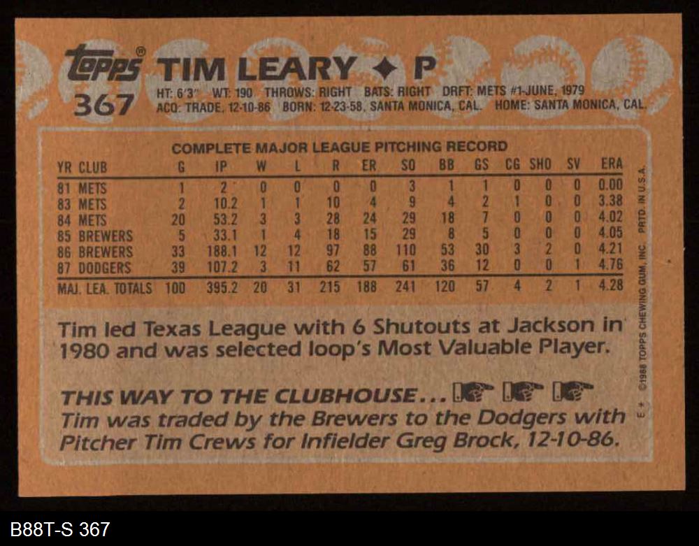 1988 Topps #367 Tim Leary 8 - NM/MT