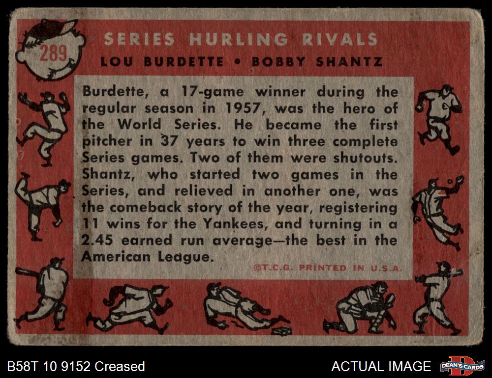 1958 Topps #289 - Lou Burdette / Bobby Shantz Series Hurling Rivals 1 - POOR