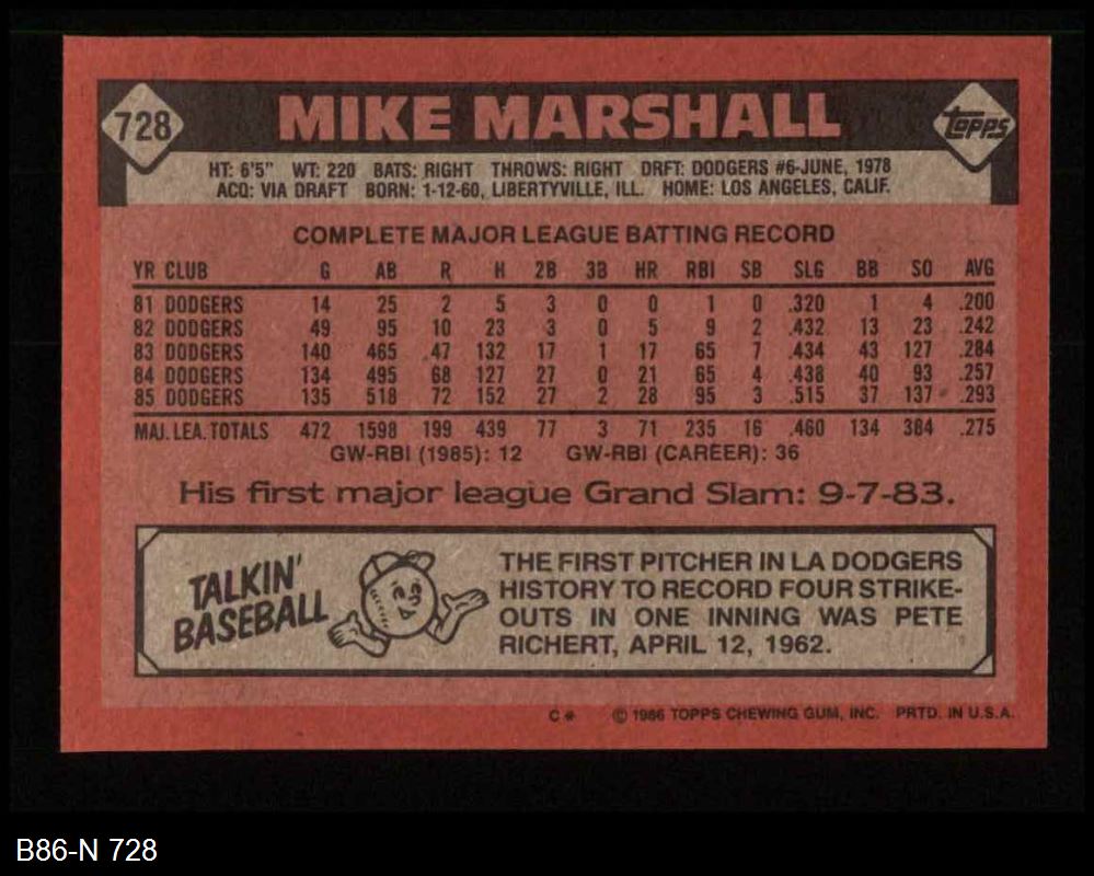 1986 Topps #728 Mike Marshall 8 - NM/MT