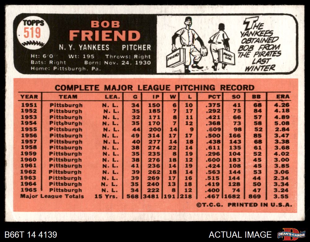 1966 Topps #519 Bob Friend 4.5 - VG/EX+