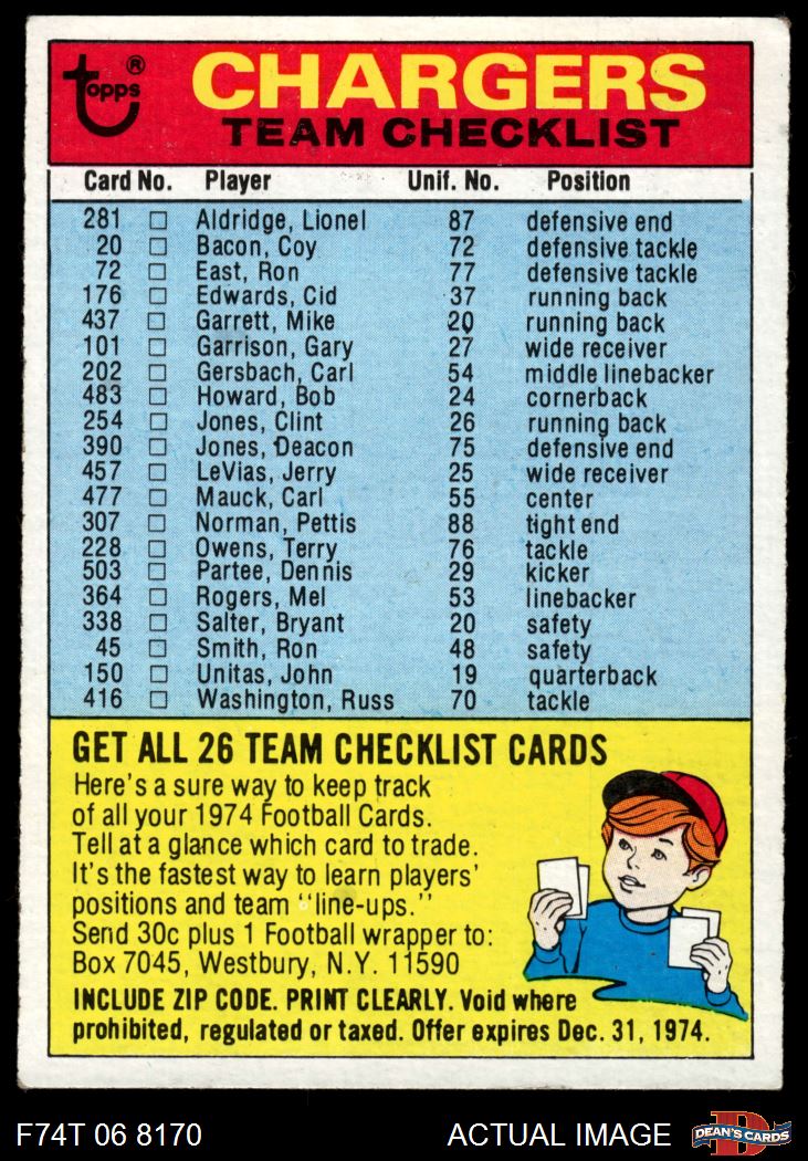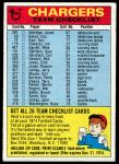 1974 Topps Checklist San Diego Chargers Team