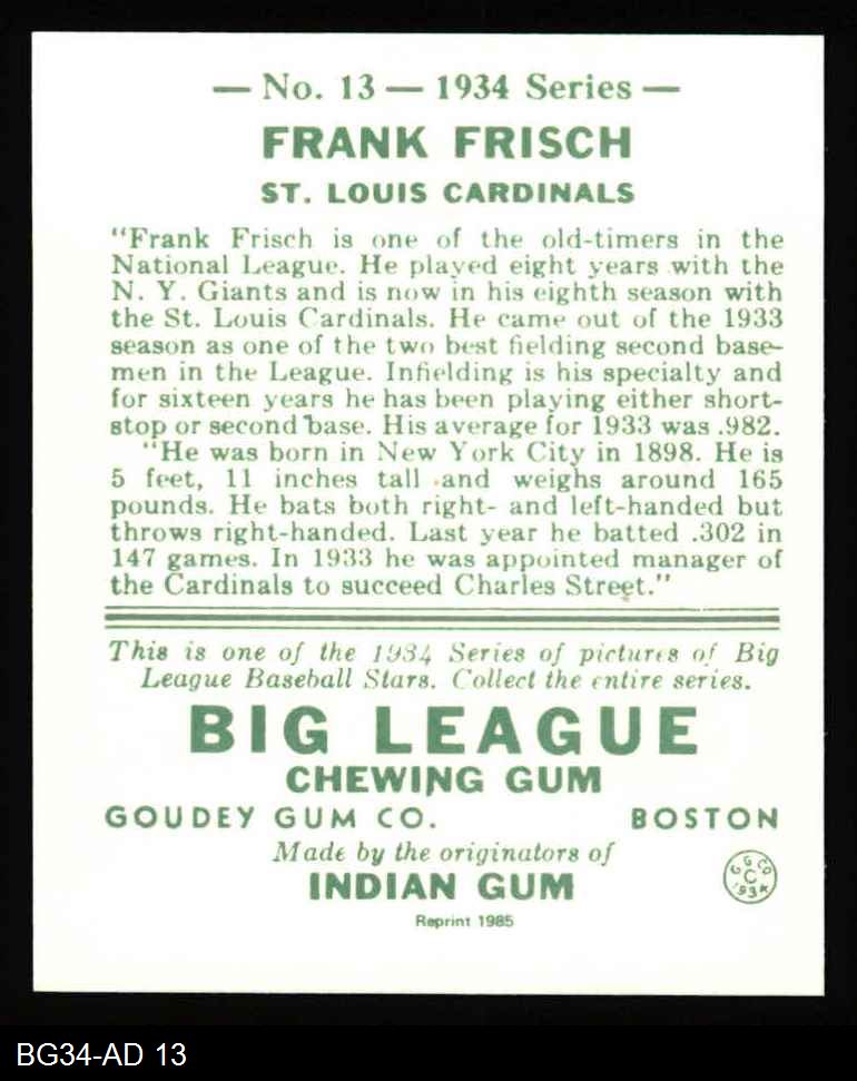 1934 Goudey Reprint #13 Frankie Frisch