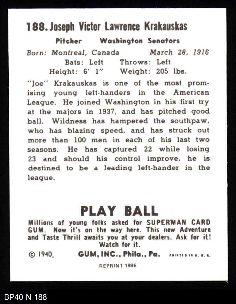 1940 Play Ball Reprint #188 Joe Krakaukas 8 - NM/MT