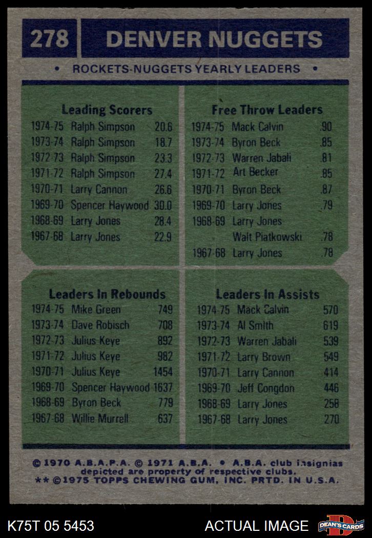 1975 Topps #278 - Mack Calvin / Mike Green / Ralph Simpson Nuggets Leaders 7 - NM