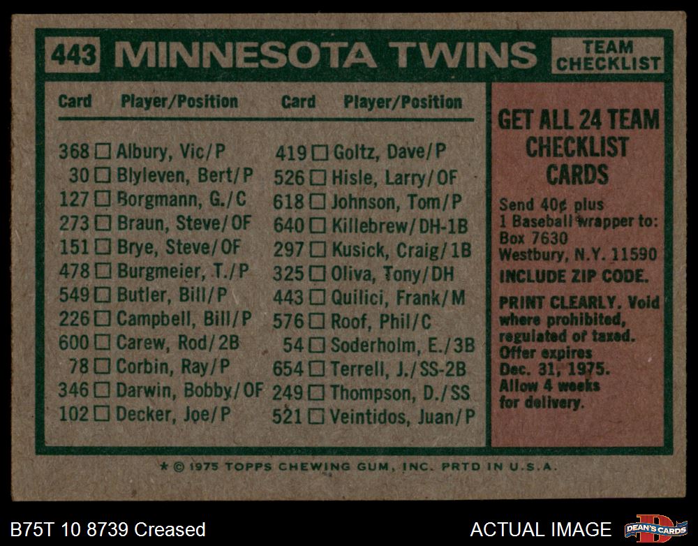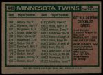1975 Topps #443  -  Frank Quilici Twins Team Checklist Front Thumbnail