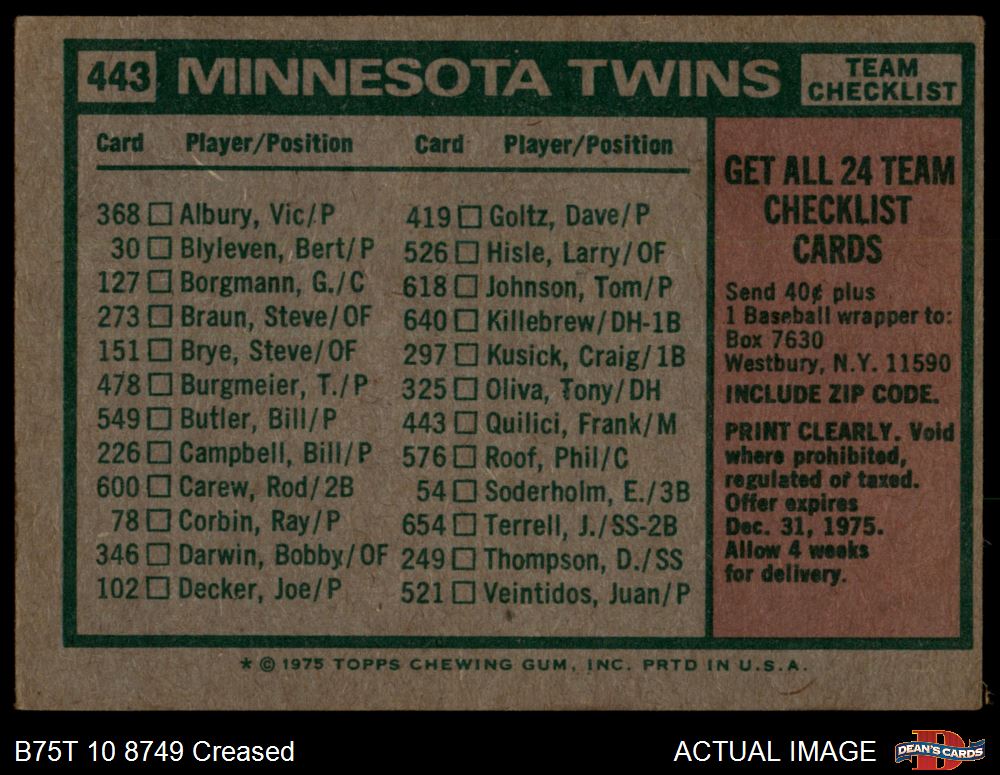 1975 Topps #443 - Frank Quilici Twins Team Checklist 3.5 - VG+