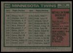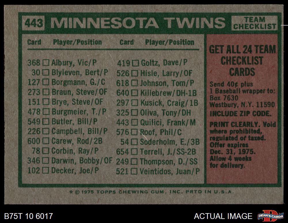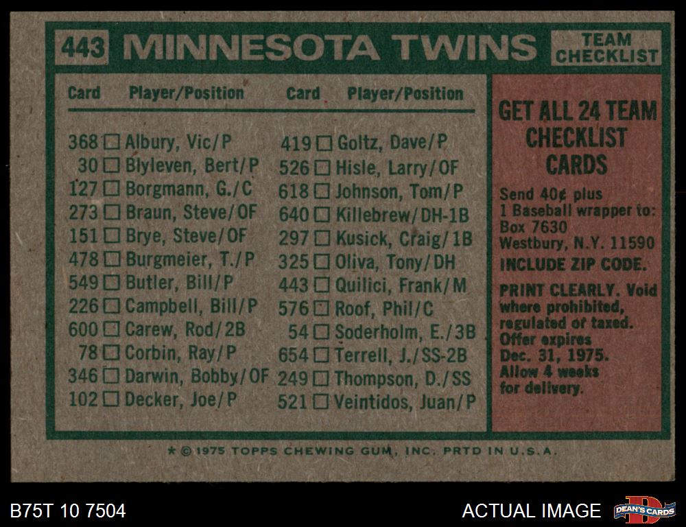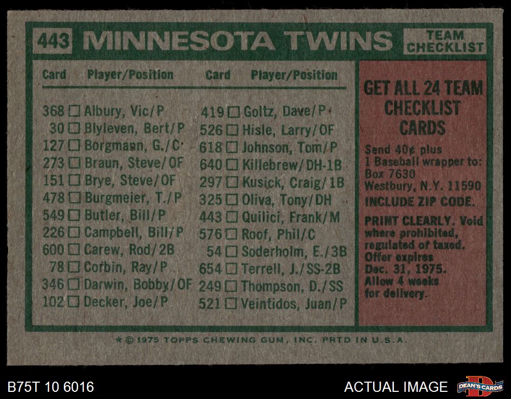 1975 Topps #443 - Frank Quilici Twins Team Checklist 6 - EX/MT