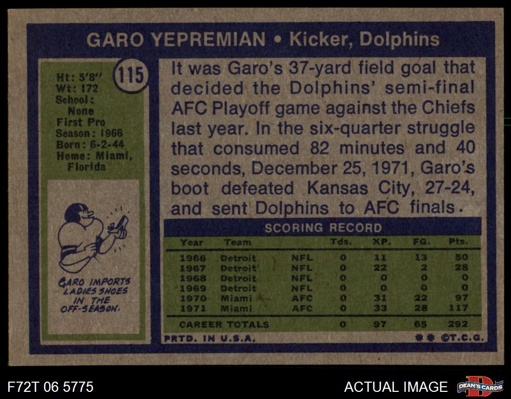 1972 Topps #115 Garo Yepremian 6.5 - EX/MT+